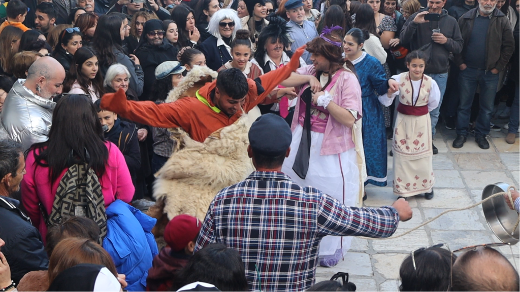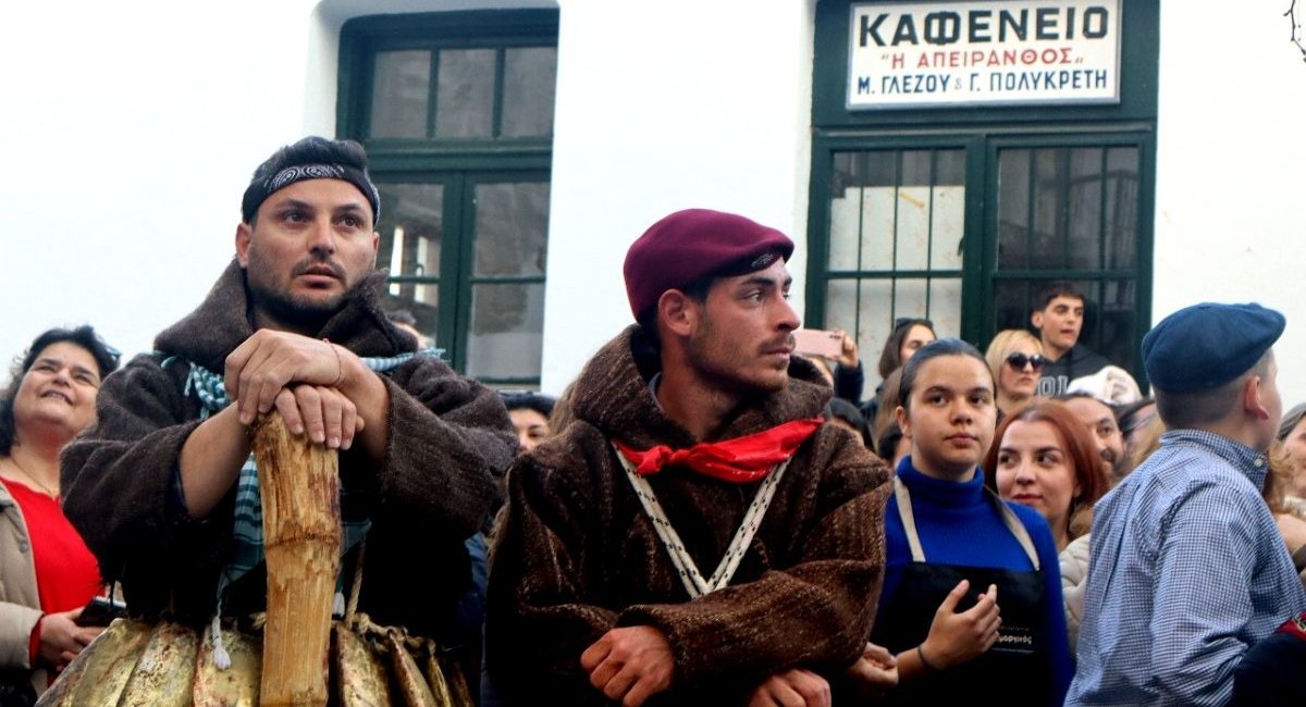Μικροί και μεγάλοι το μεσημέρι της Τυρινής –της τελευταίας Κυριακής της Αποκριάς– θα φορέσουν τις παραδοσιακές τους φορεσιές και τα κουδούνια τους, σύμβολα κληρονομιάς και παράδοσης, για να ξεχυθούν στα σοκάκια του κυκλαδίτικου χωριού και να γιορτάσουν σε βακχικούς ρυθμούς τον ερχομό της άνοιξης.